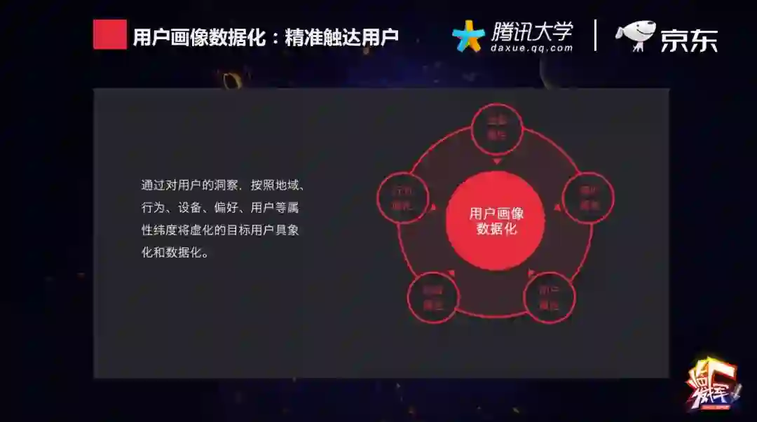 例如通过用户的交易行为,挖掘出用户的性别、学历、商品购买方式等。京东有大量的数据模型算法,通过用户的交易数据去估算这个人的用户画像。