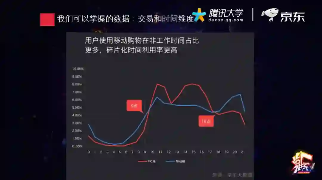 中午12点,这个曲线又会掉下去,因为用户出去吃饭了,无法在PC端上进行购物。下午2点-4点,又会拉起一个购物的小高峰,因为下午的会议又开始了,开完几个会以后,用户需要平复一下心情,再买一点东西。