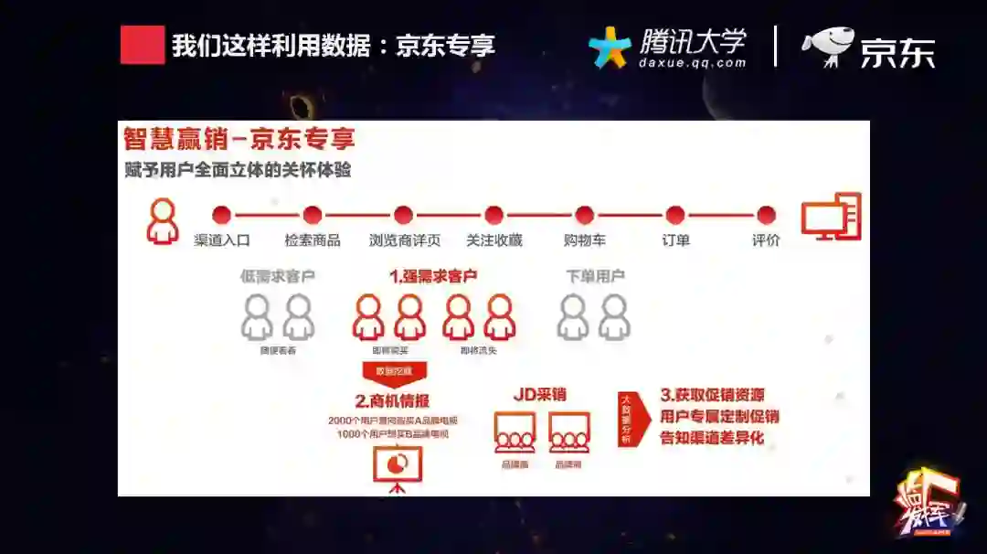 嘉宾刘晖说,这些用户距离买下商品,可能只差了一个动因,这个动因有可能是一个200元钱的配件包,或者是50元钱的现金券。为了应对这样的强需求用户,京东设置了一个项目:京东专享,这是让用户决定购买的“临门一脚”。