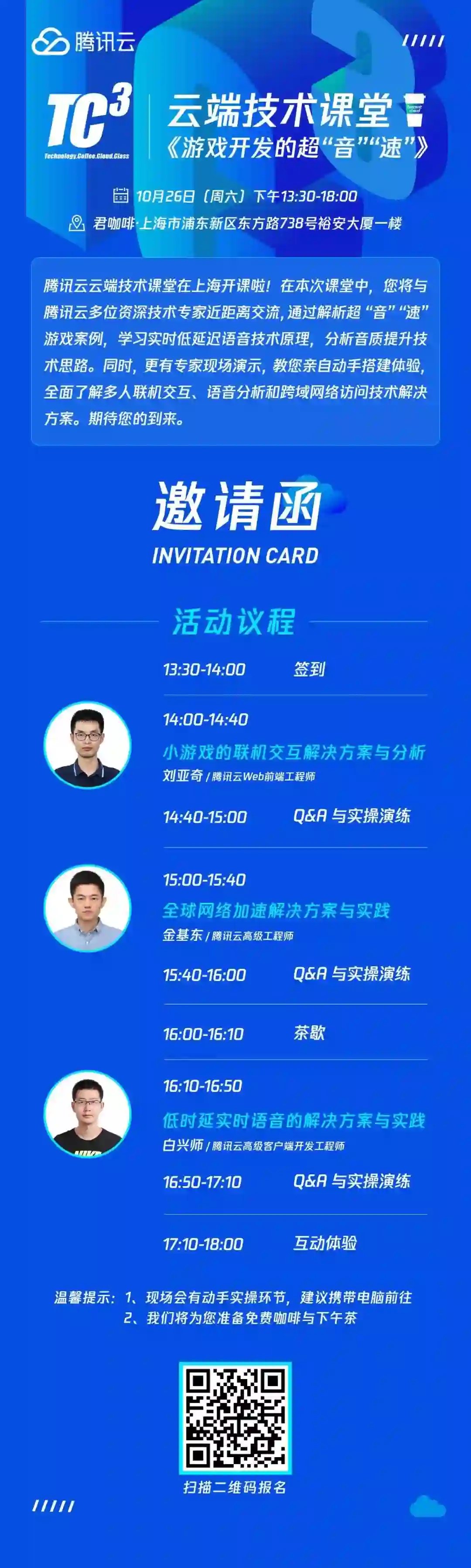 腾讯专家技术分享:内容包括:低延时实时语音解决方案实践,全球网络加速解决方案实践,小游戏联机较好解决方案分析。现场有动手实操环节,也有免费咖啡下午茶。