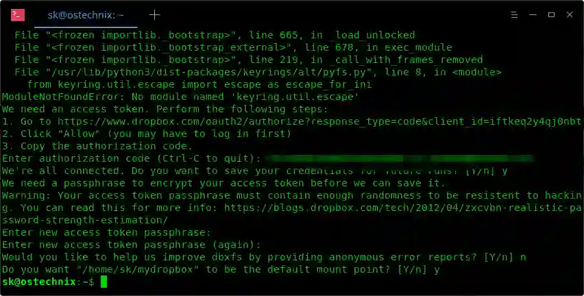 最后,输入 Y 接受 /home/username/mydropbox 作为默认挂载点。如果你要设置不同的路径,输入 N 并输入你选择的位置。