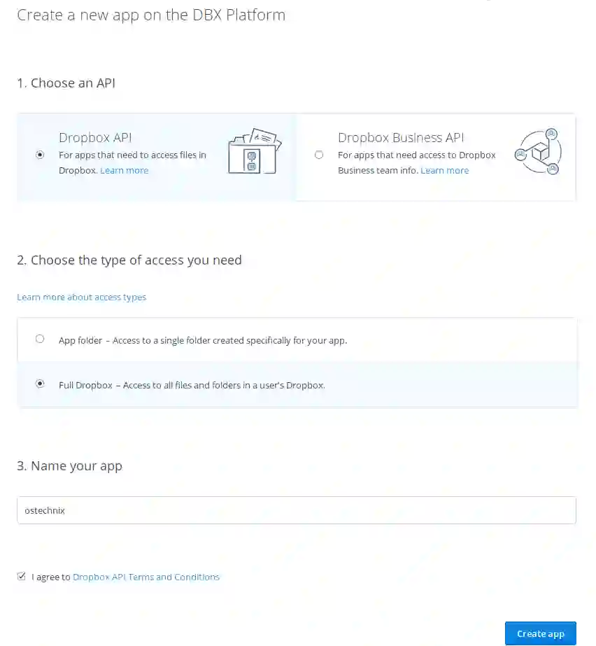 默认情况下,dbxfs 会将 Dropbox 访问令牌存储在系统密钥环或加密文件中。但是,你可能希望将其存储在 gpg 加密文件或其他地方。如果是这样,请在 Dropbox 开发者应用控制台[4]上创建个人应用来获取访问令牌。