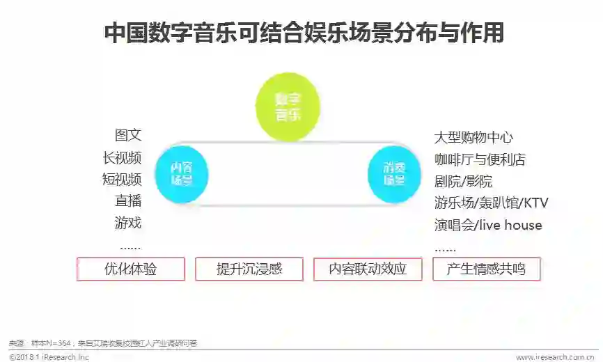数字音乐在未来将不仅满足的是人们的听觉享受,在“一人+一手机”就可以创作音乐的时代,音乐也将伴随在用户工作生活更多的场景中。1)横向来看,看视频、读文字、看资讯、做直播、玩游戏……几乎所有的娱乐消费场景都会因为恰到好处的音乐存在而产生更美妙的体验。2)纵向来看,在线下,数字音乐与大型娱乐休闲中心、商业街、咖啡厅等商业环境的结合,不仅能够提升购物体验,更能够为内容创作提供更多的灵感。而在剧院、电影院、游乐园、演唱会等以娱乐为主需求的地点和场景,合理的音乐消费也将与其他内容产生联动效应,不论是在营销推广上,还是在实际的销售与口碑上,都会产生叠加的效果。