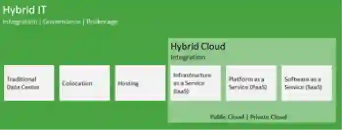 从广义上来讲,混合云的形态可以包括云与云的组合、云与传统IT 系统的组合、云与虚拟化技术的组合等。这些都是根据具体的业务场景需求,使用混合IT的方式解决具体的问题。例如,Gartner认为所有IT环境都是混合的环境,混合IT既包含传统的IT系统也包含云系统(公有云、私有云)。