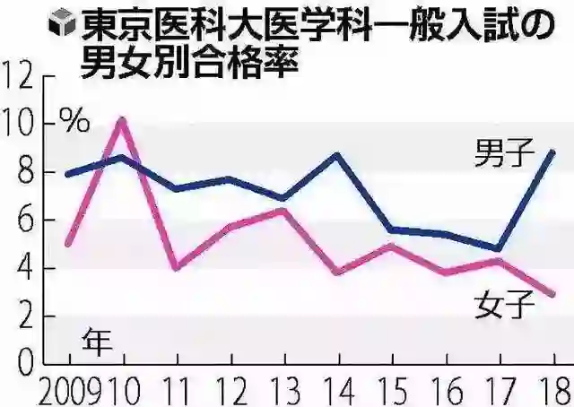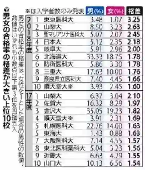 《读卖新闻》于2018年8月初进行了一项调查,询问了全日本81所设立医学部大学的男女录取比,结果显示,在76所做出回答的大学中,有59所在春季的一般考试中录取了更多男生,而且,在男女录取比差距排行前10名的受访高校中,18年的录取差距均普遍比17年还大。