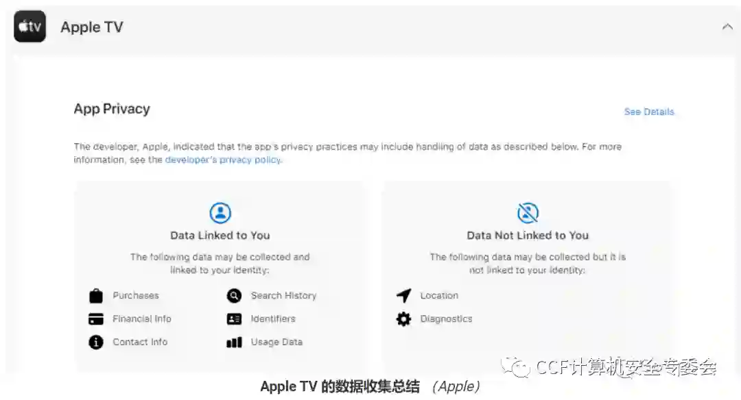 虽然谷歌的APP数据安全政策对缓解安卓应用生态中大量的恶意和诈骗应用很有意义(也有助于谷歌追溯攻击者),但该政策的实施可谓姗姗来迟,因为苹果公司早在2020年就推出了类似的“隐私标签”功能(下图):