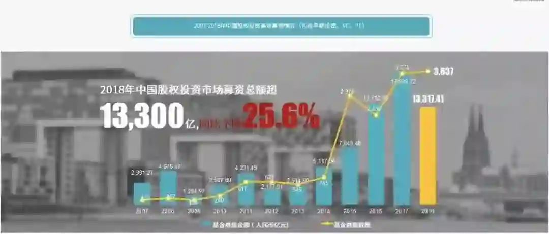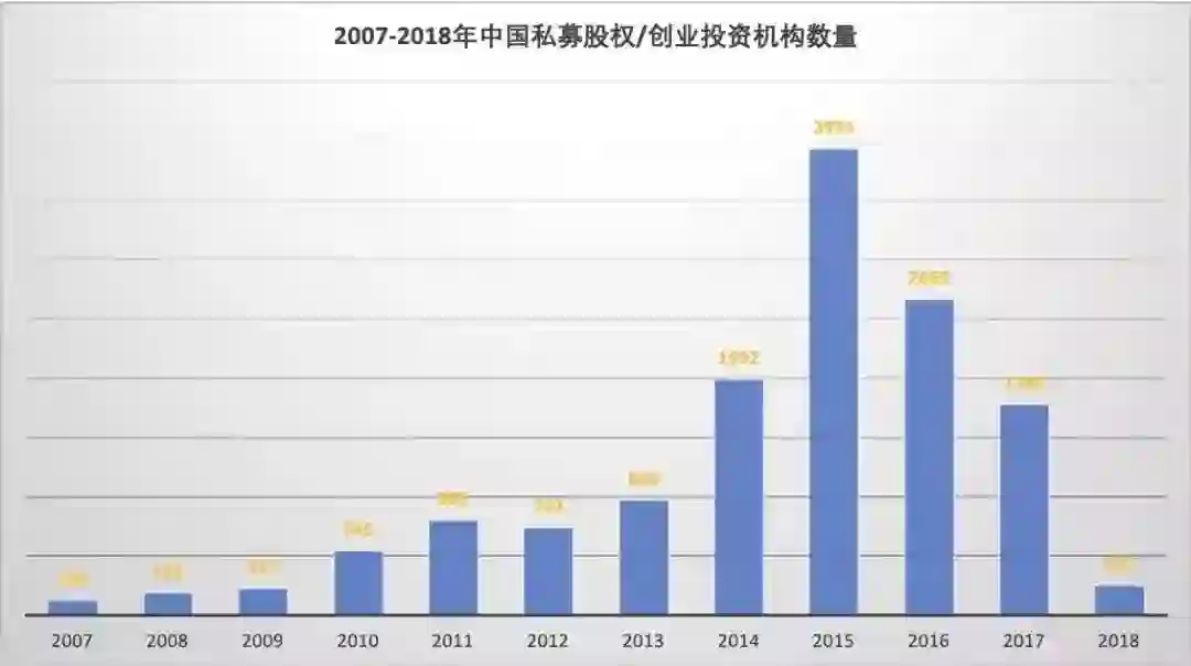 而2018年后,“募资难”使行业迎来了一轮大洗牌。清科研究中心数据显示,2018年,VC/PE募集完成基金共858支,同比下降27.1%,募集总规模1116.35亿美元,同比骤降60.16%,252家的机构数量相比较2015年的巅峰也相去甚远,从业人员也从2015年的37.94万下降到了2018年底的24.43万人。