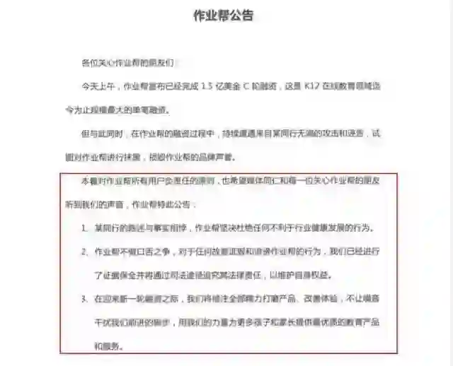 随后,作业帮也对此事作出回应,作业帮称在融资过程中,持续遭遇来自某同行无端的攻击和诬告,试图对作业帮进行抹黑,损毁作业帮的品牌声誉。“某同行的陈述与事实相悖,作业帮坚决杜绝任何不利于行业健康发展的行为。已经进行了证据保全并将通过司法途径追究其法律责任,以维护自身权益。”
