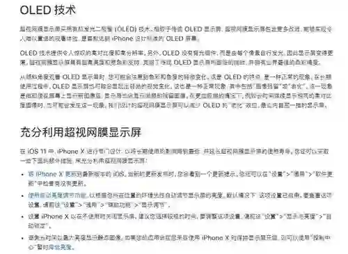 在苹果官网技术支持一栏了解iPhone X下了解超视网膜显示屏中,对超视网膜显示屏采用的OLED(有机发光二极管)技术作出了详细的介绍,既介绍了OLED技术的优势,也介绍了OLED显示屏存在的不足。
