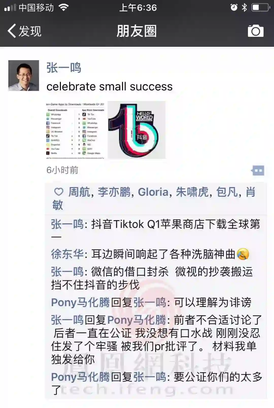 今日头条CEO张一鸣发了条庆祝抖音Tiktok Q1苹果商店下载全球第一的朋友圈,没想到引发了和腾讯CEO的一场“口水战”。