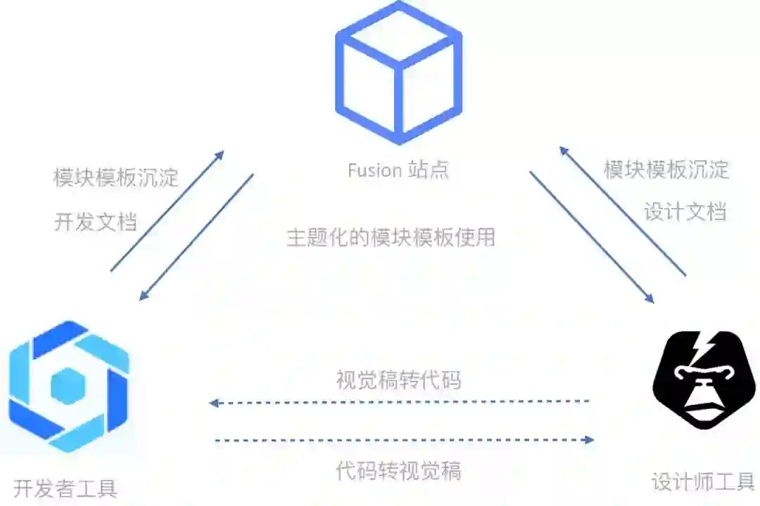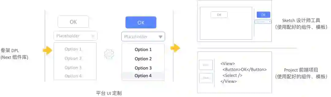 通过抽象骨架 DPL -> 通过平台定制产出定制好 UI 的组件、模板 -> 流入设计师的工具里面直接拖拽使用 -> 前端直接使用定制好的组件(不需关注组件 UI)