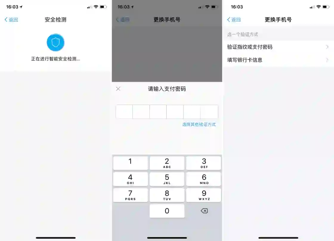作为日常支付手段之一,牵涉财务的支付宝也不要忘记换绑。进入设置中更换手机号码的界面,首先依然在更改电话号码的界面输入新的号码,然后填入收到的验证码,这时支付宝跳出了一个“正在进行智能检测”的页面,检测通过的话无需任何其他认证即可继续换绑。