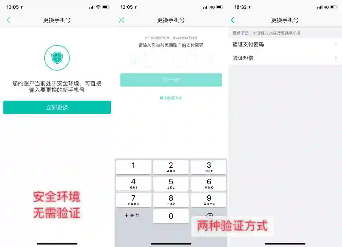 美团App 在进入更换号码的页面之前也有一个安全环境检测的界面。在我这里,连接WiFi 的时候就被判定为环境安全,而使用蜂窝数据的时候就被认为不安全,此时需要输入支付密码,或者可更换为使用短信验证。但我的校园WiFi 又是被iOS 建议为安全性较低的,真是不知道谁说得对。验证后输入新的手机号码并接收验证码换绑就完成了。