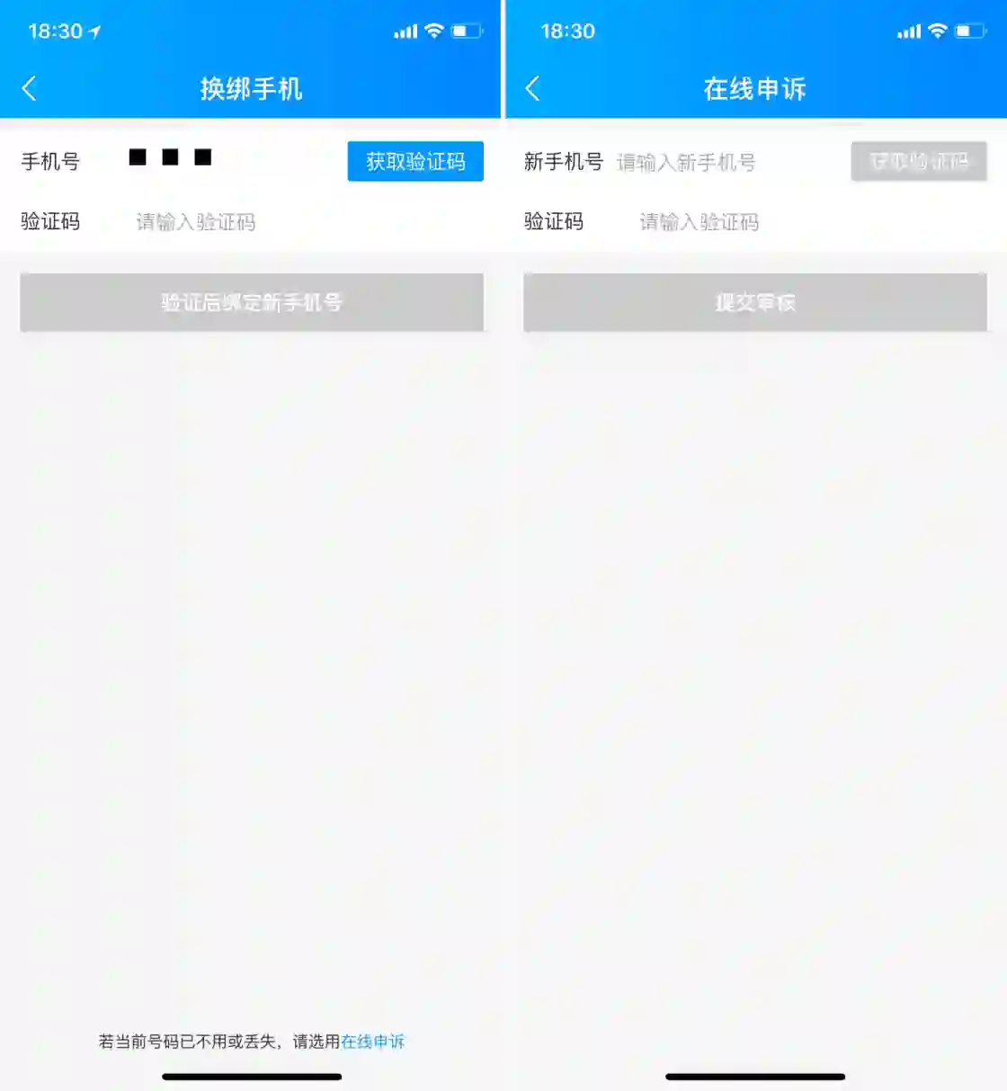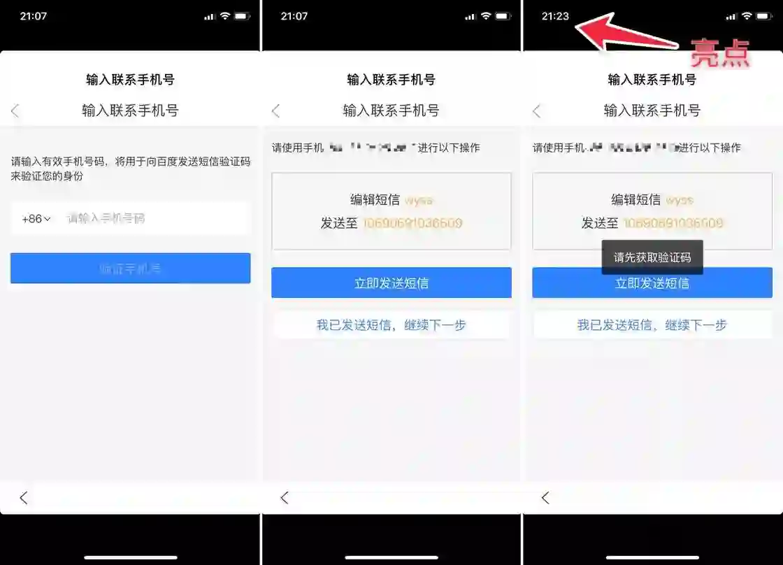 下载完App 后,在设置 - 账号管理里可以更改手机,选择“更换手机号”后依然需要旧设备验证码,填入即可换绑。不过我们仍然继续点击申诉并确定,输入联系手机号码,这时App 会要求向指定号码发送一个短信。发送完成后,点击页面上的“我已发送短信,继续下一步”,会弹出提示框“请先获取验证码”。