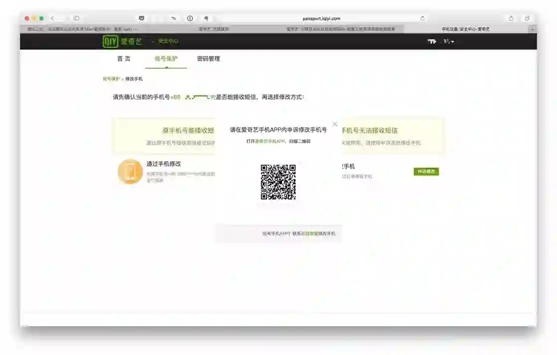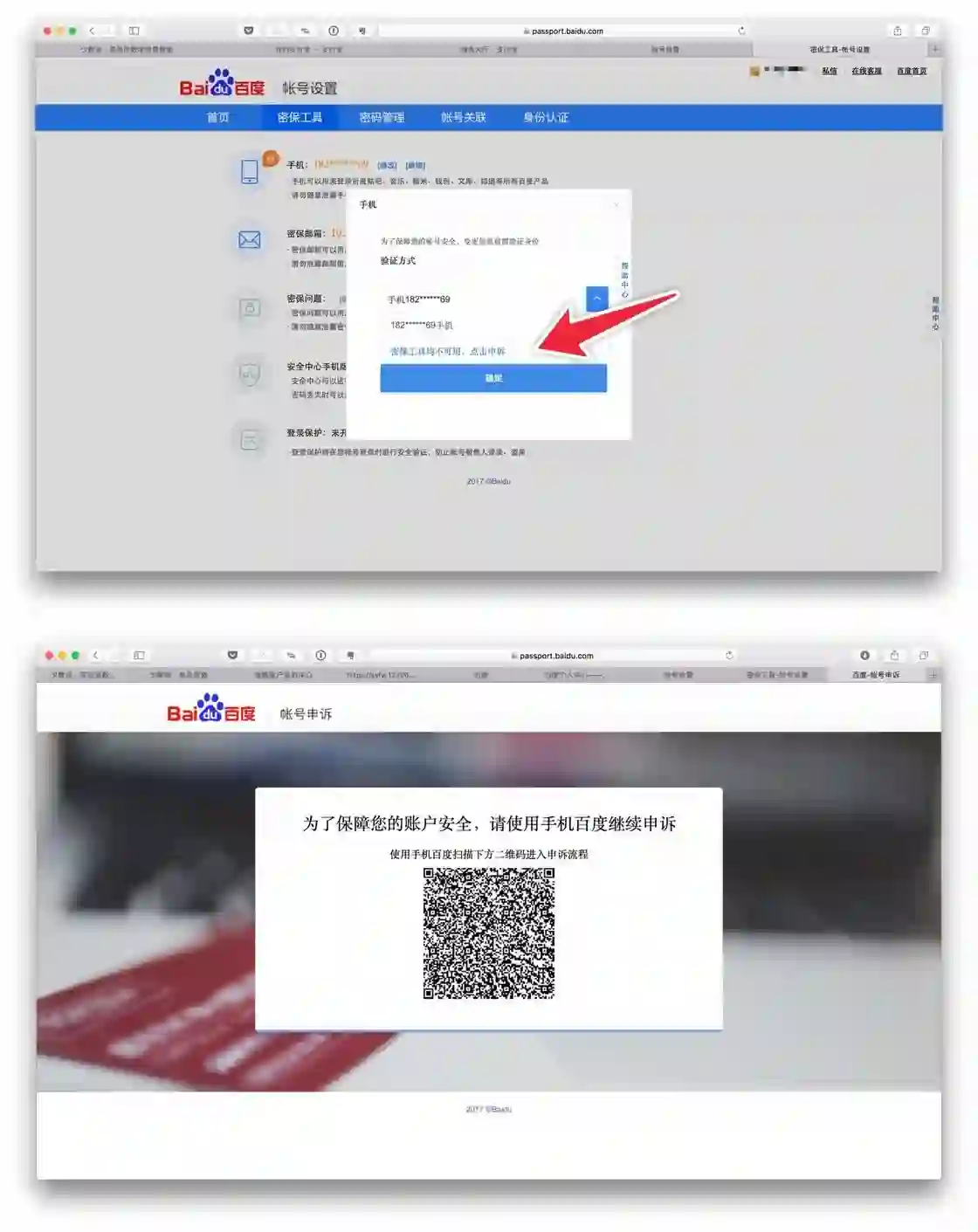 笔者的百度账号在上大学初换号码时就没有更换,种种原因导致一直拖到先在也没有换绑。由于没有安装百度旗下的App,所以这里使用Mac 上的Safari 登录账号后在账号设置页找到更换手机的位置,会弹出页面要求使用旧手机验证码验证。由于旧手机号不可用,下拉菜单选择申诉,然后百度就会引导我们扫码下载App 进行申诉……