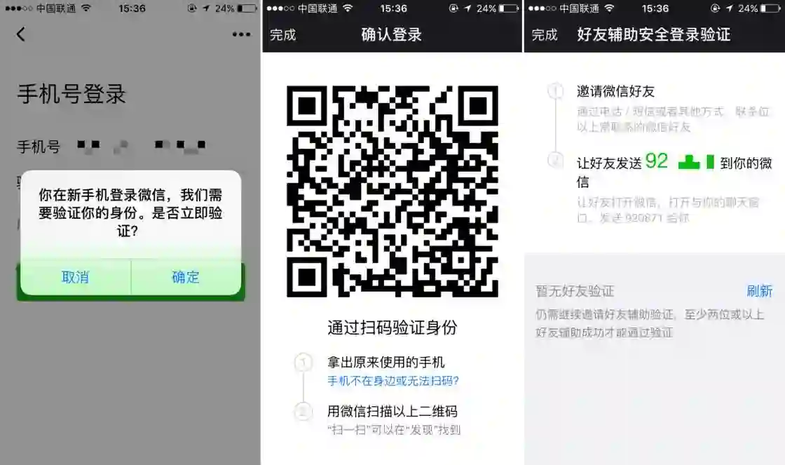 同时,她的设备上会显示这是一个新的设备,需要验证身份。选择验证后提供了两种途径:一是使用原设备扫描二维码,二是让至少两位好友向该账号发送一个验证码。