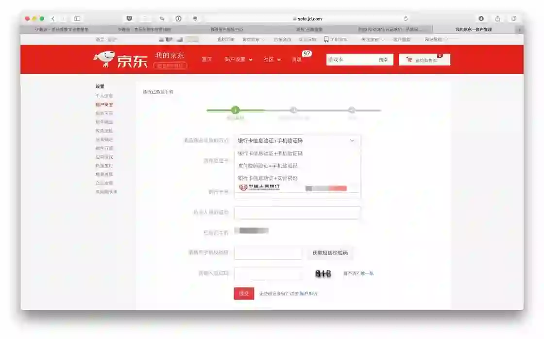 不过即使你的手机不在身边、或是忘记了支付密码,你也可以进入网页版进行更改。京东网页版提供了一个“三选二”的验证方式,你可以在手机验证码、支付密码、银行卡信息之间选择两个,颇有些两步验证的感觉。