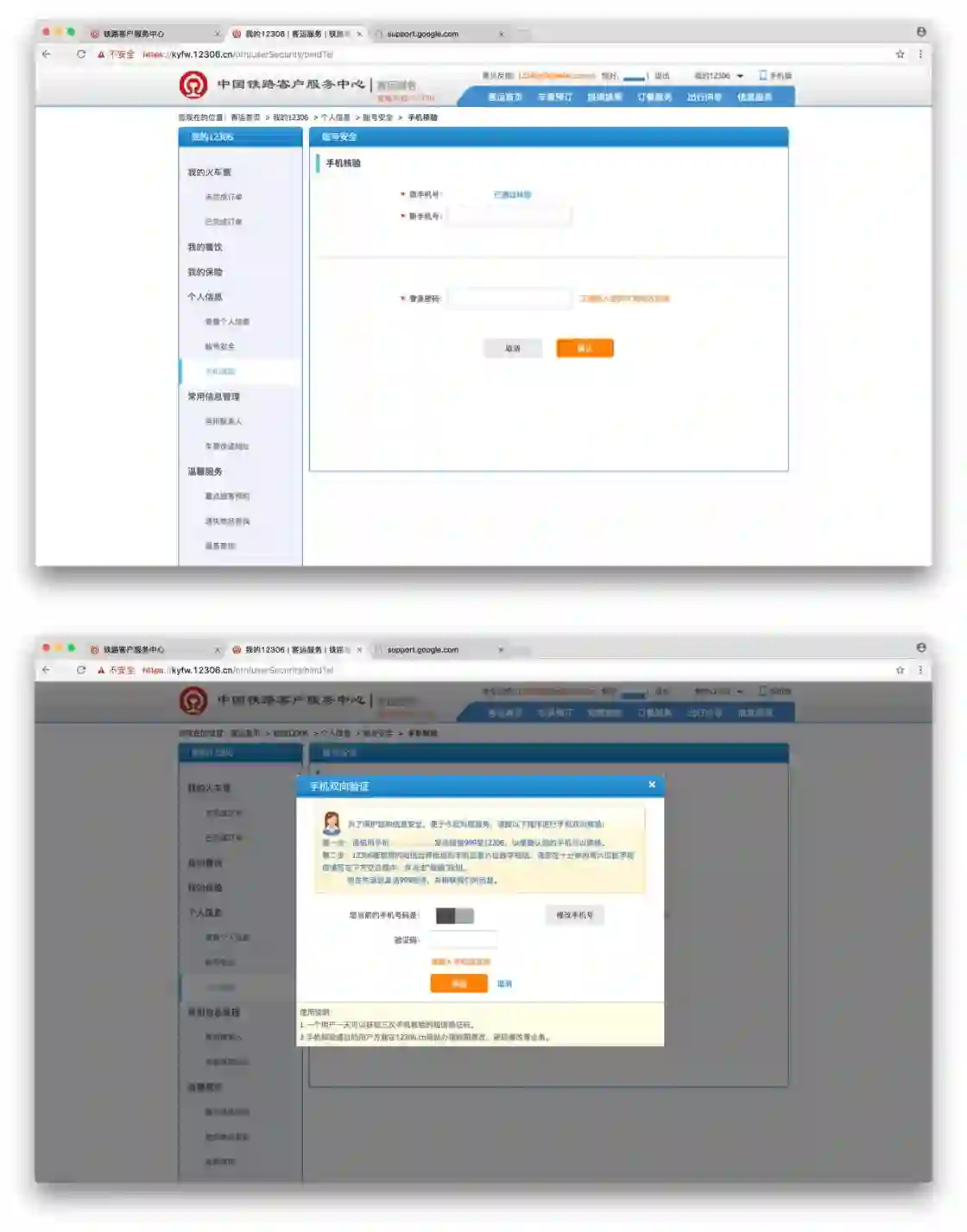 12306 就像Mac 上避不开的Office,每次看着都不爽却每次都不得不用它。手机端打开App 不能点击任何按钮,于是只能登录网页端。Safari 打开只有无休止地转圈,又不得不使用Chrome。进入账号安全当中的手机核验,原手机号已经列出,这里需要填入新手机号和登录密码。点击确认后弹出了一个”手机双向验证“的提示框,实际上就是主动请求一个验证码而已。至此就可以完成了。