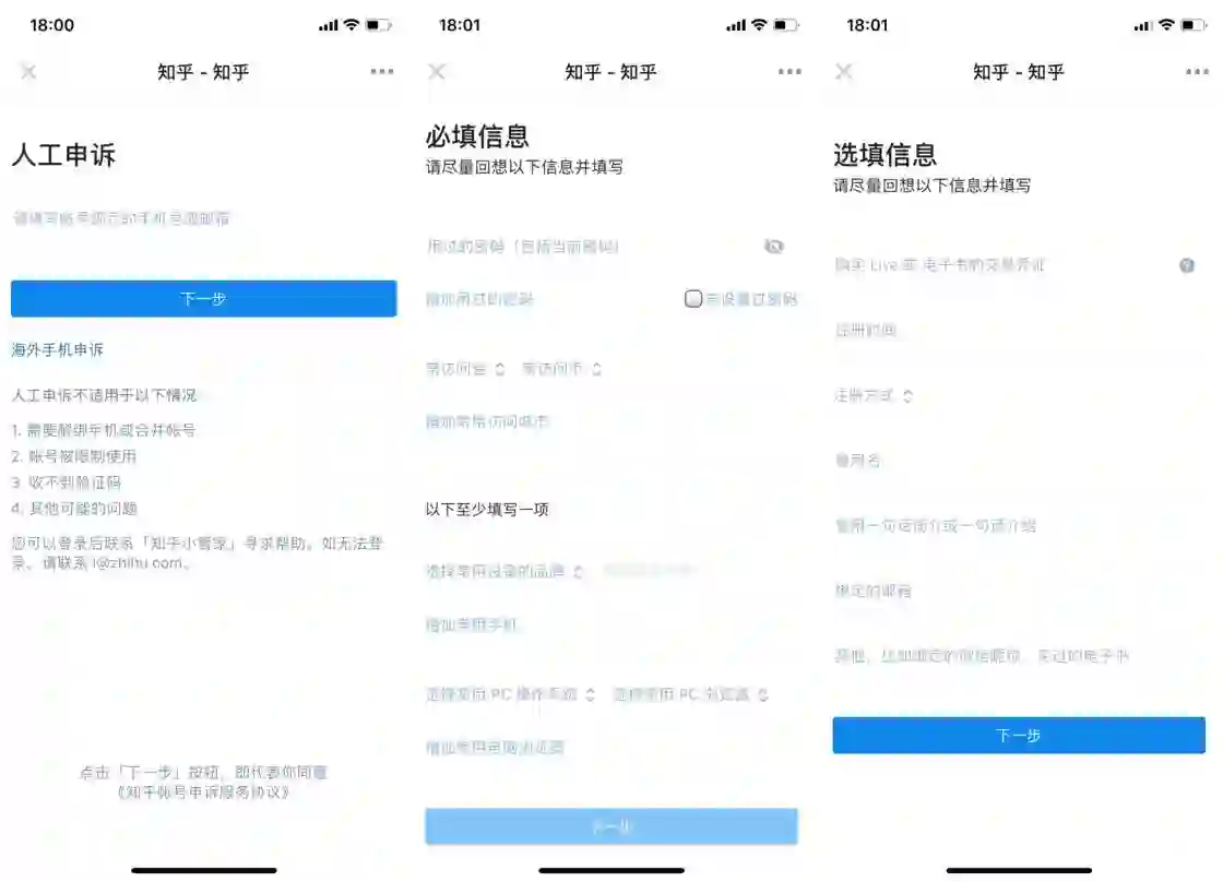 知乎的普通验证方式包括手机和邮箱验证码两种,接收验证码后即可更改新手机。不过这里提一下知乎的人工申诉,可以说是事无巨细地验证了各种信息,必填与选填一应俱全,最后还要再填一遍接收消息的手机和收到的验证码。这样就更看得出使用验证码的便利性啦。