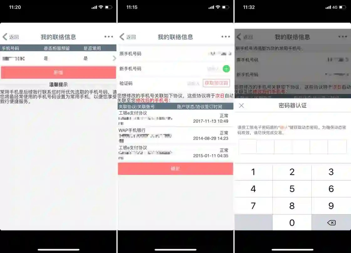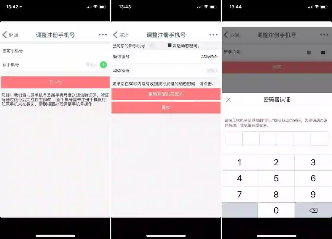 银行账户虽然不是互联网账户,不过绑定的安全性也很重要。我这里只有工商银行的卡,所以只以其为例作为尝试。感谢评论区里侧脸君的提醒,我才发现工行App 的设置中有调整注册手机号和手机号管理两项,看起来一个像是登录手机银行用的,另一个像是业务联系用的。先来更改第一个。进入页面后输入新号码,填入发来的验证码(它每次都会发两次),第三页的验证方式是使用工行的密码器获取动态密码,与以上各种方式都不相同,虽然略有麻烦但出于安全还是可以理解的。