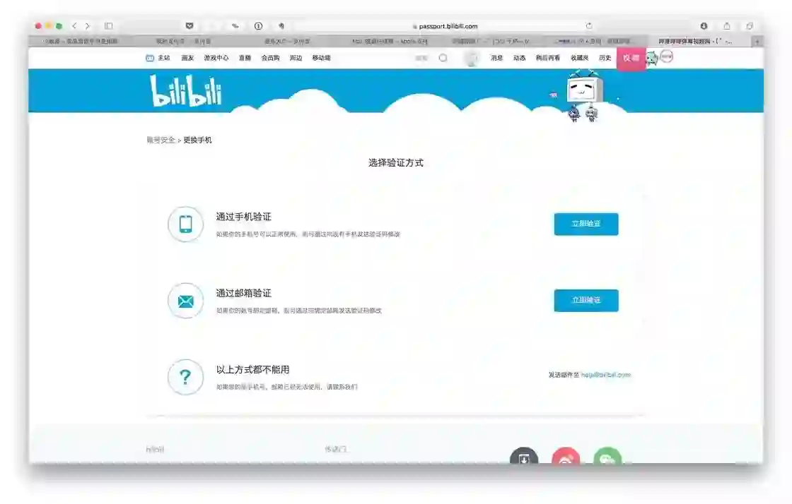 这里以Bilibili、爱奇艺与优酷为例,三家的验证方式都差不多。B 站的身份验证方式有手机和邮箱两种,获得验证码后再填入新号即可。如果两种验证方式都不可用,也可以选择向帮助邮箱发送邮件让客服帮你处理,这里就不调戏Bilibili 娘了。