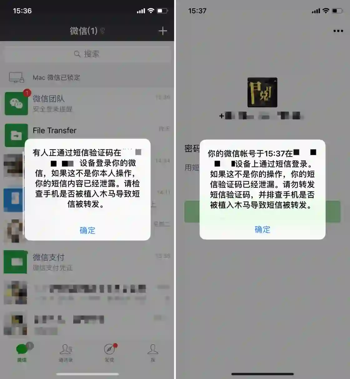 不过微信如何保证被换绑的手机号不是陌生人的呢?为此我和朋友专门做了一个测试:首先在我的微信换绑设置里输入她的号码,填入她收到的验证码,在这一步,绑定账号成功。接下来,使用她的设备再通过手机验证码登录我的微信账号时,我的手机微信上会弹出提示,告诉我有人在登录我的微信账号: