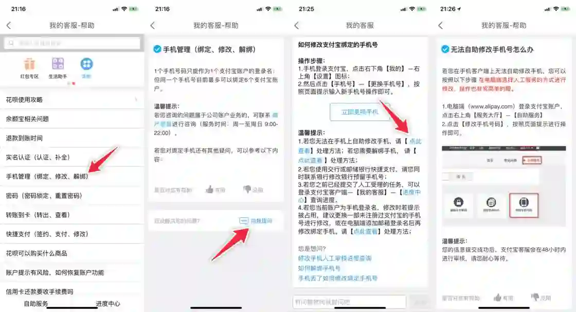 我们可以看到,同一个手机绑定的支付宝和淘宝账号是联动的,更换其中之一即可。如果你的“支付密码”和“银行卡信息”两条路都走不通,还可以去支付宝的网页上申请人工处理。