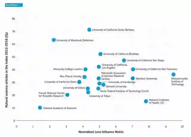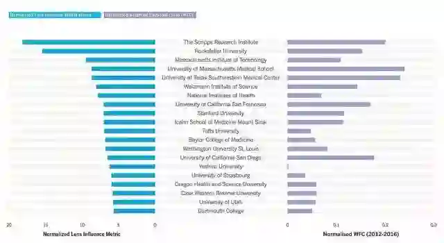根据归一化加权分数(normalized weighted fractional count),Lens 指标最高的一些机构,发表的论文自然指数也很高,这表明其论文质量很高: