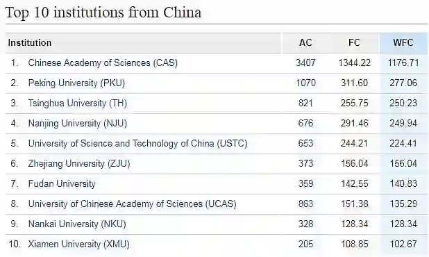 而具体到机构,中国科学院(CAS)以 3407 篇论文、1176.71 的 WFC 分值位列第一,北大、清华名列第二、第三。