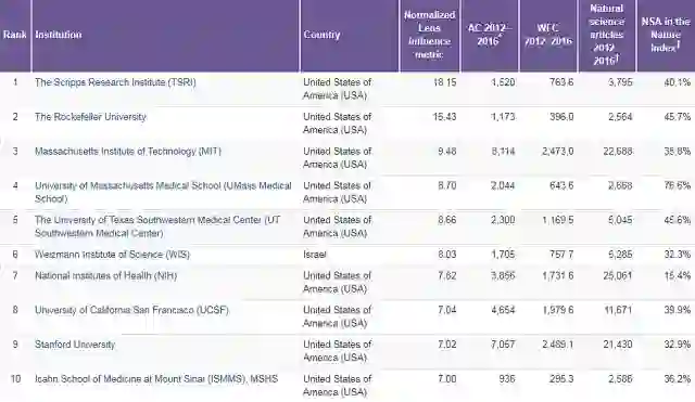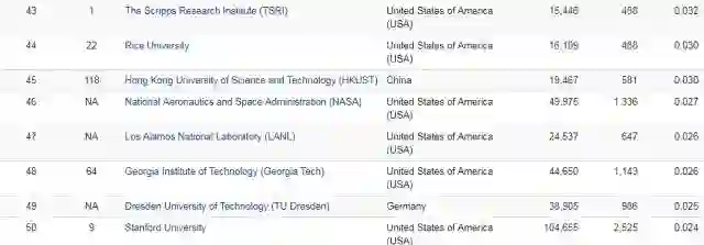 值得注意,Top 10 中唯一的非美国机构来自以色列——排在第 6 的魏兹曼科学研究所(WIS),而韩国的汉阳大学(HYU)排在第 23,是亚洲国家机构里最靠前的。