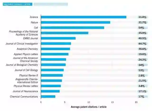 Lens 分析还将自然指数中包含的杂志按照其每篇文章的平均专利引用做了排名,如下图天蓝色柱状图所示,Science 排在第一,Nature 以 0.1% 的差距紧随其后。