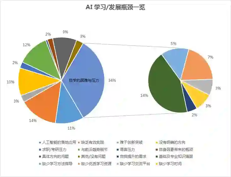 对此,CSDN 于近日放出了一份相关问卷,根据截至目前的有效反馈数据显示,关于「目前面临的 AI 学习/发展瓶颈」这一问题,34% 的人填写了自己在自主学习过程中遭遇的难处或承受的压力,其中包括缺乏专业基础知识、缺少学习方法指导、缺少优质学习资源、缺少学习时间等细节因素(详见下图)。下面就让我们开个「土味贴」,聊一聊 AI 技术学习的痛点一二三。