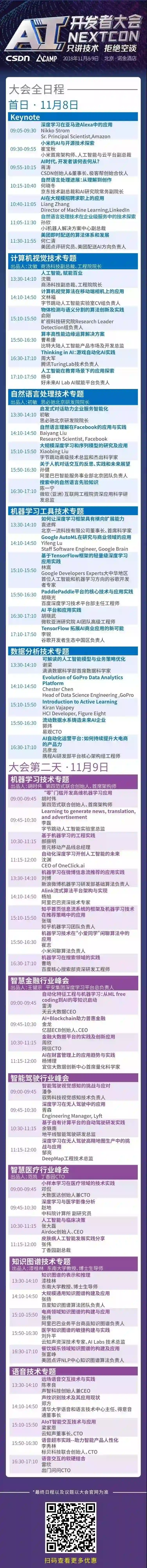 11月8-11日,CSDN与硅谷AI社区AICamp联合举办的2018 AI开发者大会将在北京召开。2日大会+2日培训,届时来自BAT、美团、京东、小米、字节跳动、滴滴、商汤、旷视、思必驰、微软、Google、Amazon、Facebook、LinkedIn等国内外领军企业的60余位一线技术大咖将带来一场技术头脑风暴。