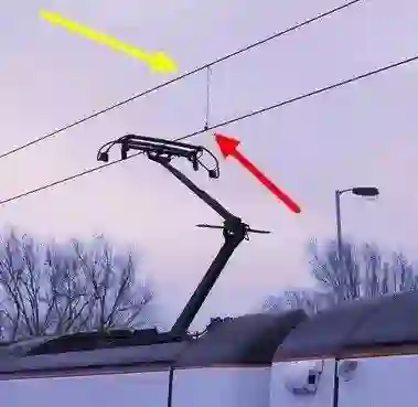 铁轨上方的线有两根,顶部那根起到悬挂的作用,而下方的那根线才是与受电弓接触的线。