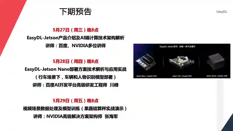 在本周 5 月 27 日至 5 月 29 日,将会是 EasyDL 产业应用系列的英伟达 NVIDIA 专场,来自百度 AI 开发平台部的高级研发工程师、高级产品经理将会联手英伟达多位讲师,为大家从产品、技术架构来介绍新上线的 EasyDL-NVIDIA Jetson 系列软硬一体方案,并会为大家带来两个实战案例:行车场景下的车辆和人物识别模型与使用 EasyDL-Jetson Nano 部署方案;使用 deepstream 进行果蔬结算称案例的视频数据处理与模型训练。