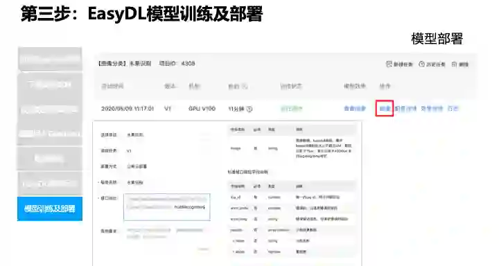 接下来再演示一下模型训练完成之后部署,再用另外一个数据集,因为刚才这个模型已经部署过了,我们用另外一个训练出来的模型部署一下。点击部署,可以选择部署方式,我们选择公有云 API,可以取一个服务名称,需要补充接口地址。这个时候点击开始部署,确定。