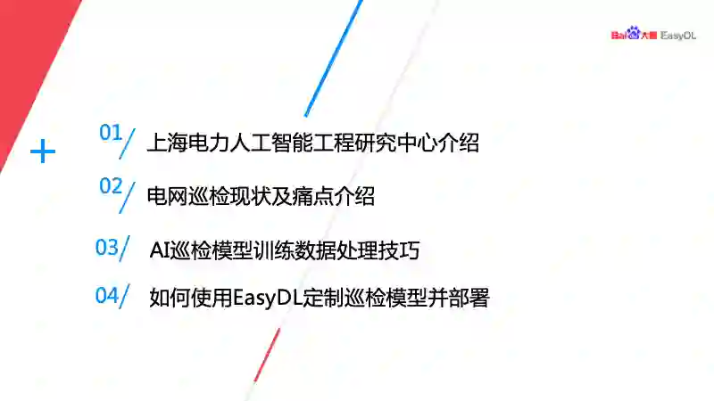 今天我介绍分三部分,首先介绍上海电力人工智能工程技术研究中心的情况,然后再分析电网巡检的现状及痛点,最后介绍如何使用 EasyDL 定制电网巡检模型并部署。