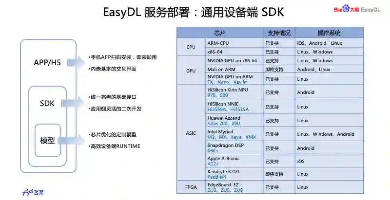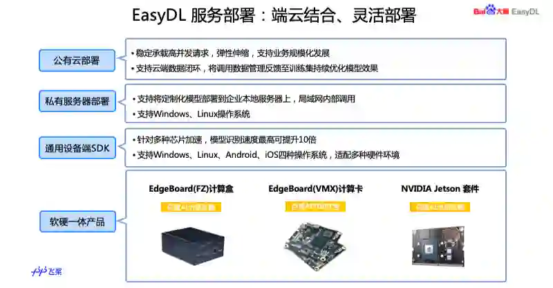 第三种方式是通用设备端的 SDK,这个是面新手机和嵌入式硬件设备,可以把 SDK 集成到手机 APP 或者宿主机,广泛支持不同硬件和操作系统,针对各种芯片也做了加速。还有我们提供的软硬一体产品,这个是把性能的方案和专项适配的 SDK 相结合,提供了多种方案可选择,包括百度自研的 EdgeBoard 系列,还有 EasyDL-NVIDIA Jetson 系列。