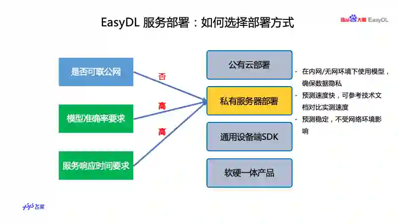 想必大家会关心在自己的应用场景下如何选择,简单介绍一下选择方法。首先公有云部署是最容易上手的,如果能连接公网对服务响应要求不是很高可以快速集成,就像田老师课程中讲的,生产环境是离线的,也可以先用公有云部署进行试验,再离线做部署。