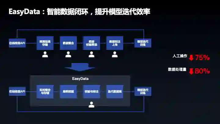 智能化还体现了标注环节,EasyData 提供了智能标注的功能,针对图像数据只需要标注大约 30%,就可以使模型效果和全量数据效果模型一致。大概原理就是先标注少量数据,然后智能标注再进行模型的预训练,训练完以后会有一些不确定的示例再次确定,需要用户参与确认,经过几轮迭代,模型的准确率就会变高,智能标注就会完成标注,整体可以减少 70% 的标注量。