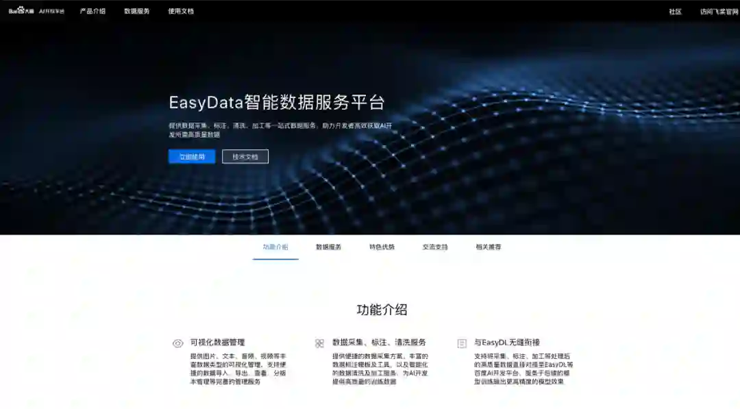 下面看一下它大概的结构,首先说一下为什么要推出 EasyData 这款产品。主要有三点,大家可能都知道,AI=数据+算法+算力,百度 EasyData 一站式开发平台在算法和算力和部署上做了很多工作,有 EasyData 经典版和专业版,虽然支持了部分数据的功能,像现在一些数据已经上传,但是不是很系统,所以我们针对数据进行了梳理,推出了 EasyData 智能数据服务平台。