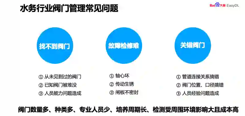 传统的阀门巡检管理还存在这对于人员专业能力要求高,而且培训的周期特别长,要是真正成为一个老师傅,这个周期要一到两年的师傅带徒弟的方式。第二就是巡检的周期长,进度慢,管理者考核难。第三就是在爆管的时候会存在水没的情况,第四就是外单位的堆没,前面已经提到了,由于建筑垃圾的堆没和城市道路的翻新堆没了。