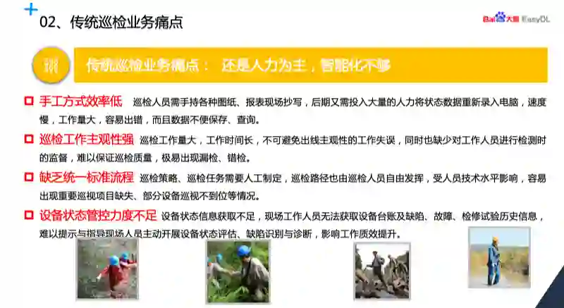 传统的电网巡检我们分析一下它的痛点,它的问题主要是呈现在四个方面,一是手工方式效率比较低。二就是巡检的主观性比较强。第三个问题就是缺乏统一标准流程。第四个方面是设备的状态管控力度不够。刚才的暖场片里大家也看到了一些场景,反映了我电网巡检的一些正常的作业方式,也就是说还是依靠大量的人力投入来实现巡检的。PPT 上有几张简单的图可以看出来,在某些场景巡检是非常辛苦的工作。