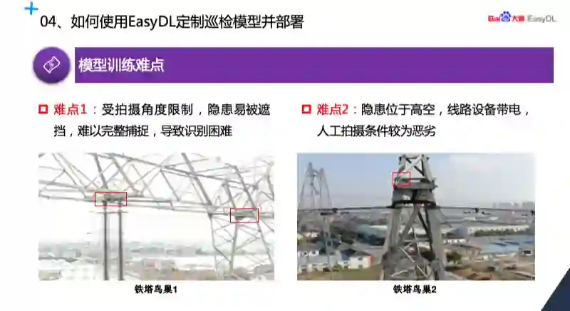 在我们的训练过程当中,我们总结了一下难点主要有两块,第一就是受拍摄角度的限制,鸟巢的位置往往容易被输电构架遮挡,难以完整捕捉到非常清晰的鸟巢,因此识别比较困难。第二个难点,因为鸟巢都处在高空,因此人工拍摄的条件比较恶劣,我们更多的时候是依靠无人机拍摄。