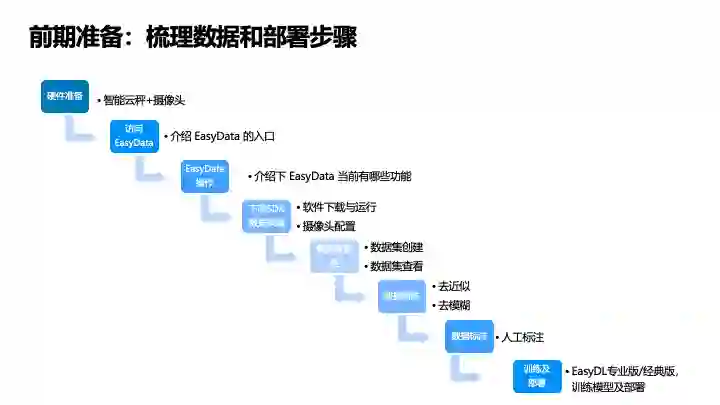 这个图展示了从硬件到准备部署的全流程。首先准备一个秤和摄像头,访问 EasyData 入口,一直到最后的模型部署的训练。接下来会走到实操的环节,我会在页面上给大家演示一下整个 EasyData 的数据接入到训练部署的流程。