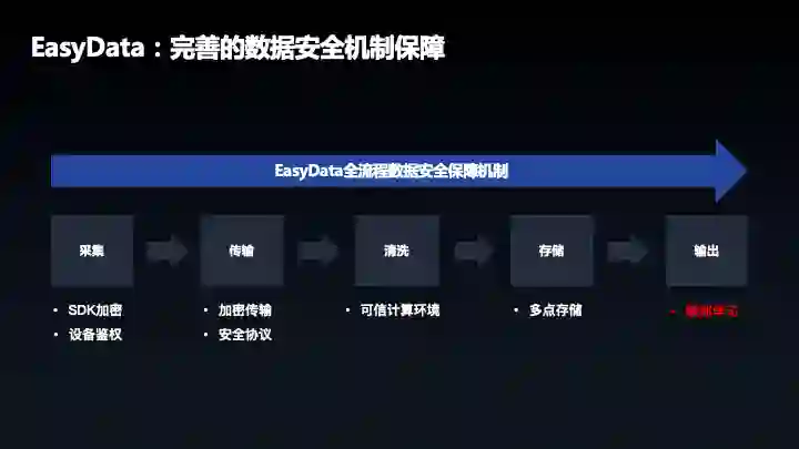 最后讲一下大家都比较关心的数据安全,数据安全这个点在 EasyData 设计之初就已经考虑到了,全流程环节中保证了数据的安全,如采集端的数据鉴权,加密输出,后续 EasyData 会考虑引入联邦学习的方式,做到数据不出安全区而用于深度学习的模型训练。