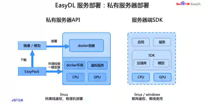 接下来会对刚才说到的几个离线场景的部署方式进行简单的介绍。私有服务器部署有两种方式,一种是刚提到的私有服务器 API,用户在本地服务器部署和云端一致的 API 服务,这个是我们用了百度的 Easy Pack 工具,是一键部署工具,会对机器的硬件环境检查,看是否适合安装,比如 Docker 环境,还有鉴权服务,然后部署一个 Docker 容器,访问容器中的服务和云端的 API 两种服务。