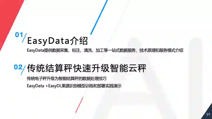 今天主题分为两部分,首先我介绍一下 EasyData 智能数据服务平台,之后会结合智能云秤的案例演示一下接入数据的训练到部署的流程。EasyData 智能数据服务平台是一个提供数据采集、标注、清洗、加工等一站式数据服务,助力开发者高效获取 AI 开发所需高质量数据的平台,4 月份刚刚上线。