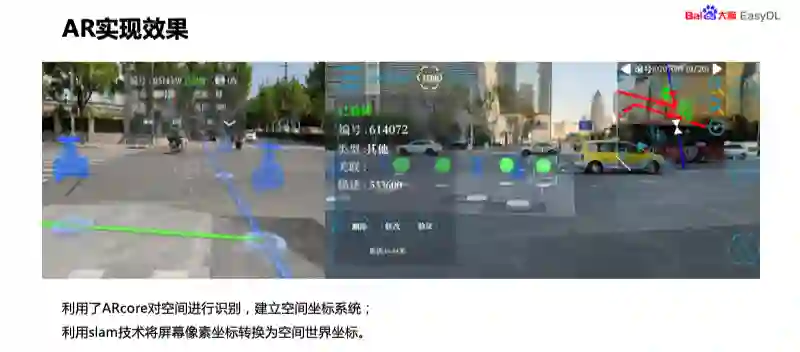 这是我们的 AR 实现效果,可以看到这是阀门的虚拟物体,叠加到现场的阀门之上,瞄准框指向的位置显示出阀门的编号包括它的口径和转数、转向,这都是上海地区的截图。主要是利用了 ARcore 对空间进行识别,建立空间坐标系统,利用 slam 技术将屏幕像素坐标转换为空间世界坐标。
